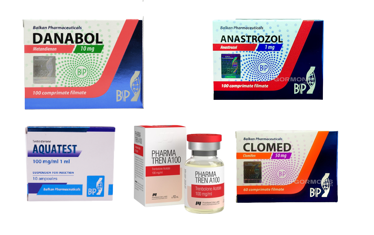 Препараты входящие в курс: aqauatest (28 ампул по 1 мл), trenbolone acetate (3 флакона по 10 мл), methandienone (112 таб по 10 мг), anastrozole (15 таб по 1 мг), clomed (30 таб по 50 мг)